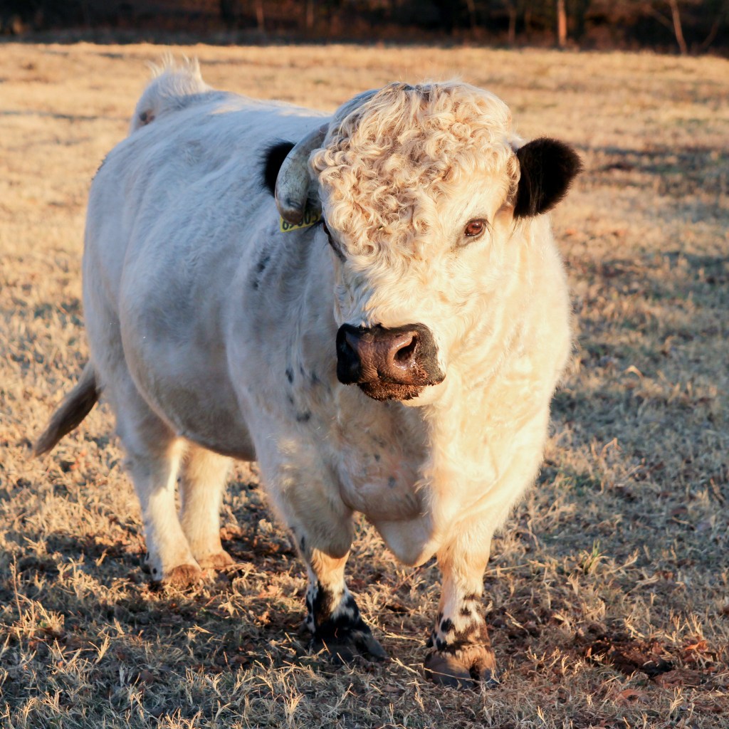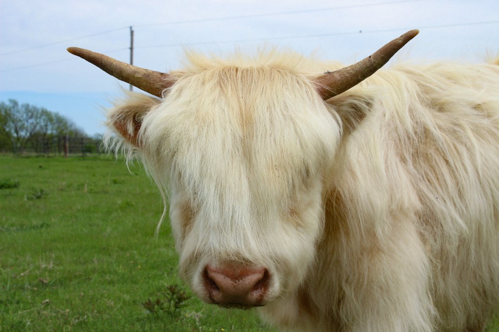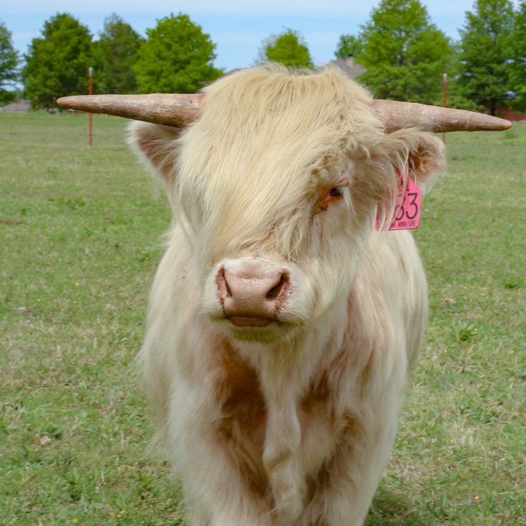 Tarb is a white Highland and a real charmer! He’s affectionate not only with his fellow cows but with anyone who ventures into the pasture with a brush. Although he still has some growing to do, being chondro-positive means he’ll stay on the smaller side.