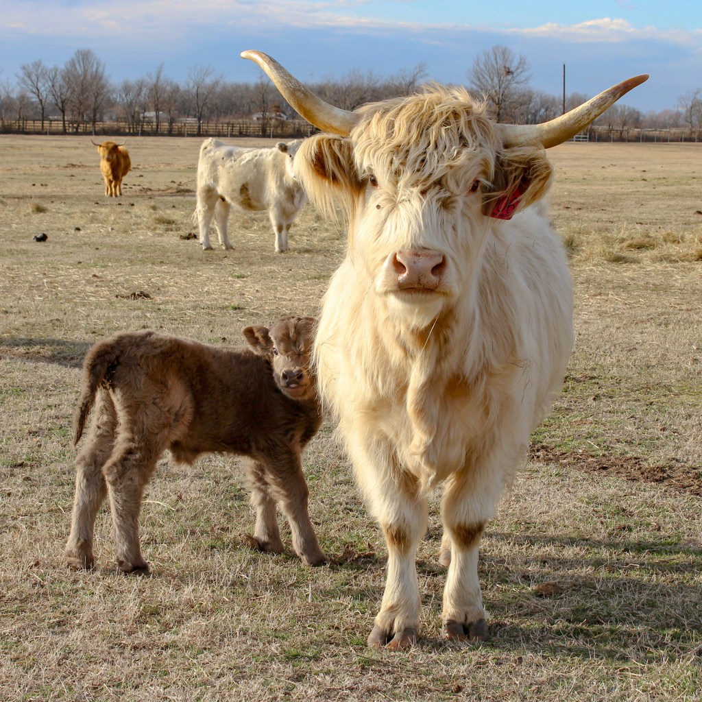 Ava is a white Highland cow, shown here with her adorable dun bull calf, who has since been sold.