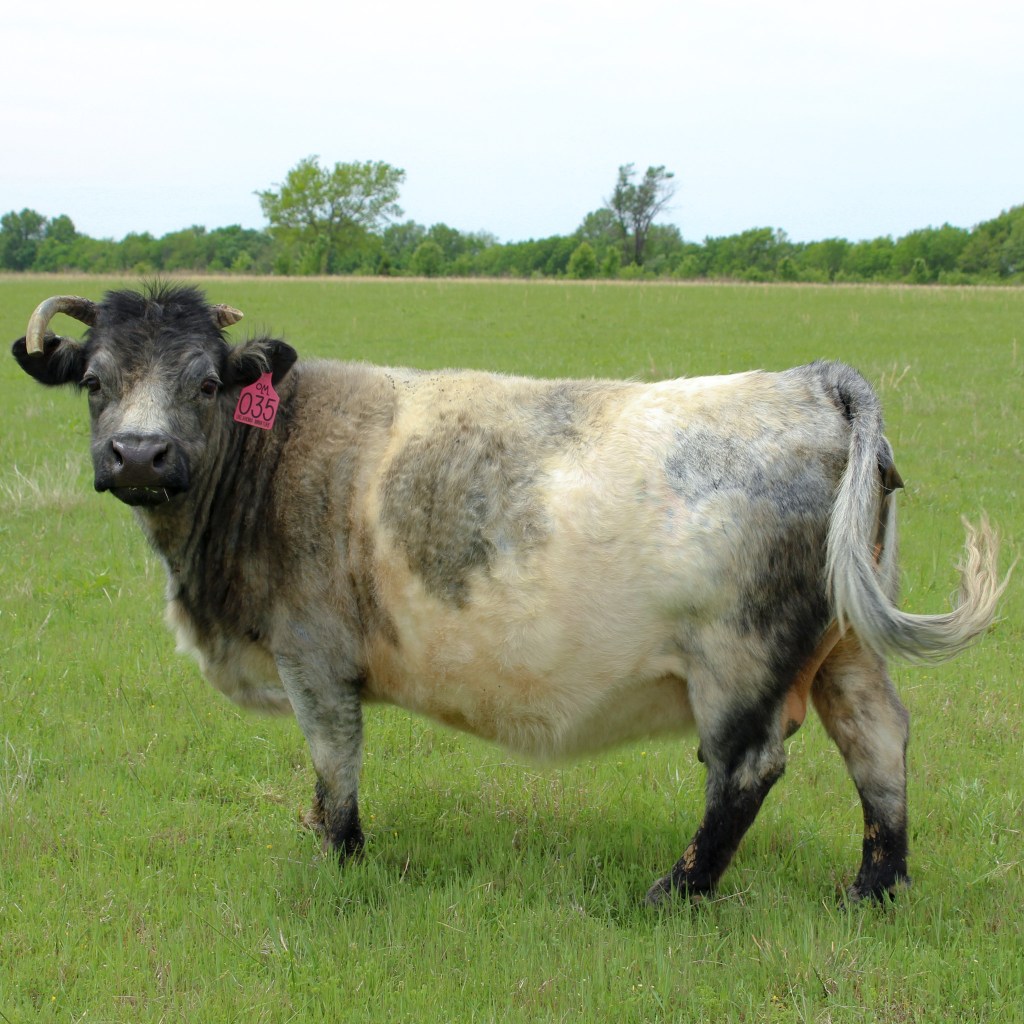 Bonnie Blue is a charming mother with a chondro-positive status and a stunning blue roan color. She’s tremendously unique, and her distinctive qualities shine through, even beyond her eye-catching color and funky horns.