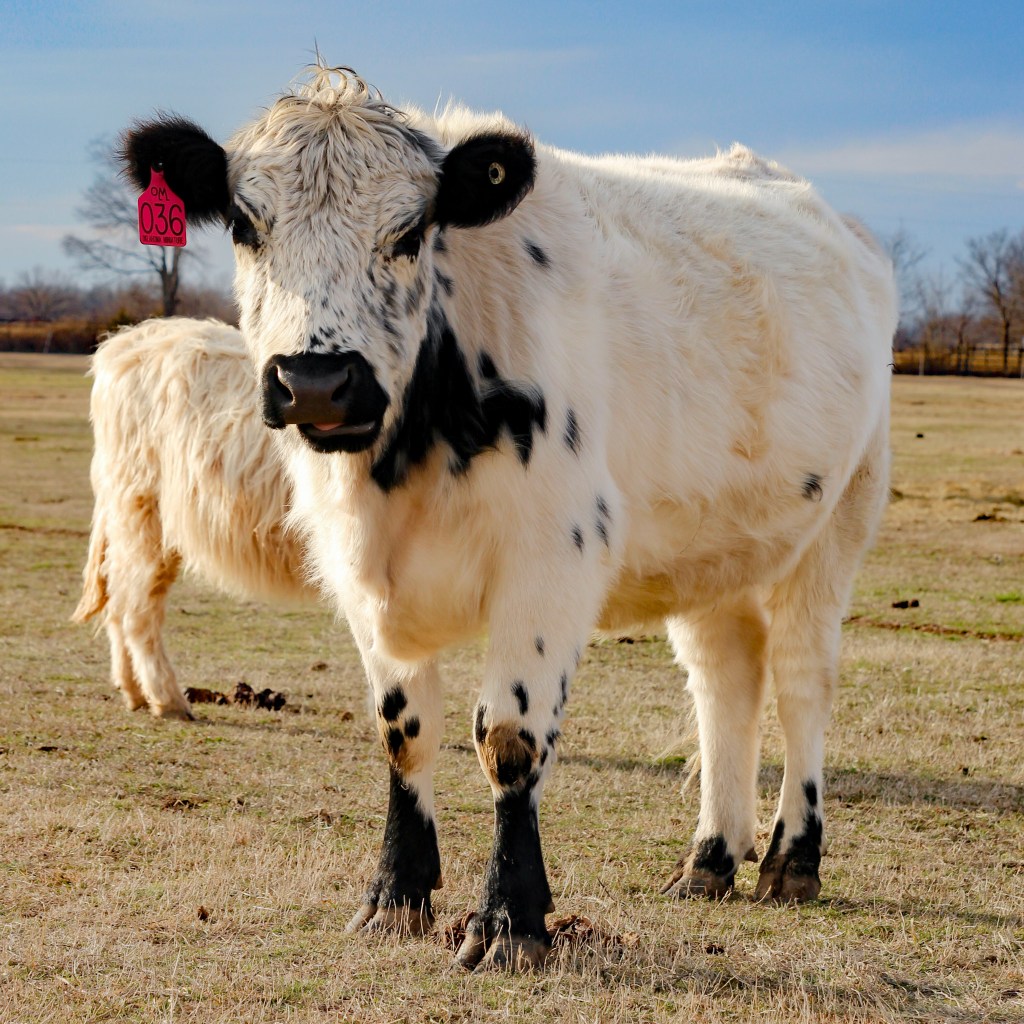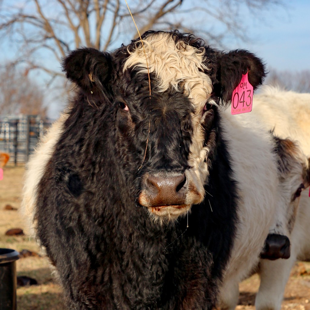 Kewpee is a wonderful example of an extremely furry Belted Galloway who seems to have had a love affair with a hay bale just before her photo was taken. She also resembles the cow version of Ziggy Stardust, adding a touch of rock star flair to our herd.